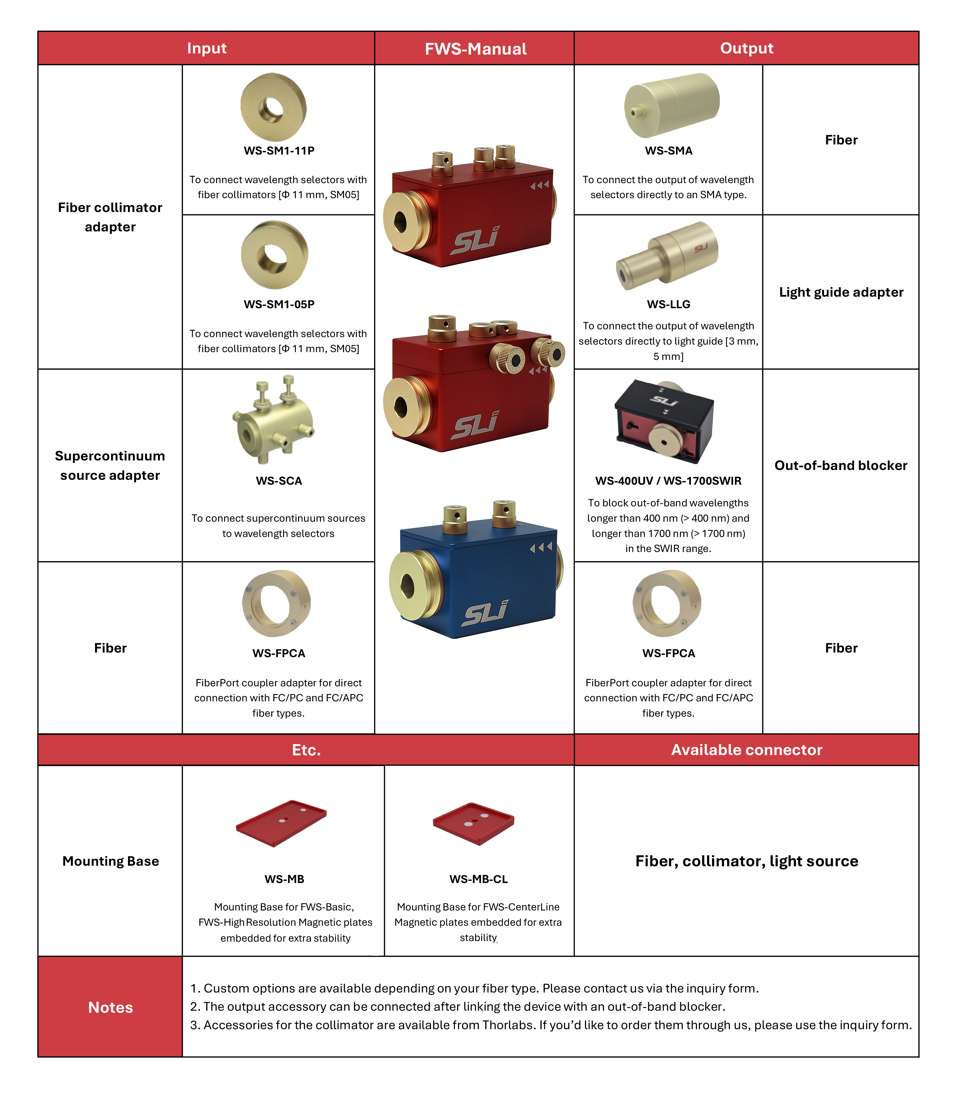 Various accessories for the FWS including input and output linkers, extender and mounting bases.