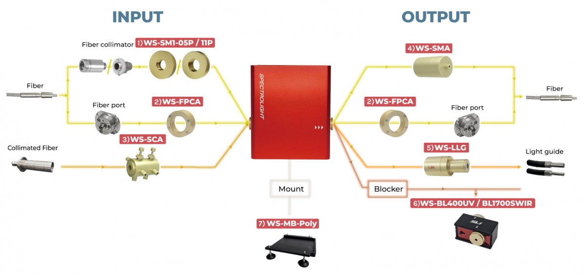 Output accessories for blocking out-of-band wavelengths - WS-BL400UV : Blocking longer than 400 nm -> To isolate UV wavelengths - WS-BL1700SWIR : Blocking longer than 1700 nm -> To isolate wavelengths between 400–1700 nm