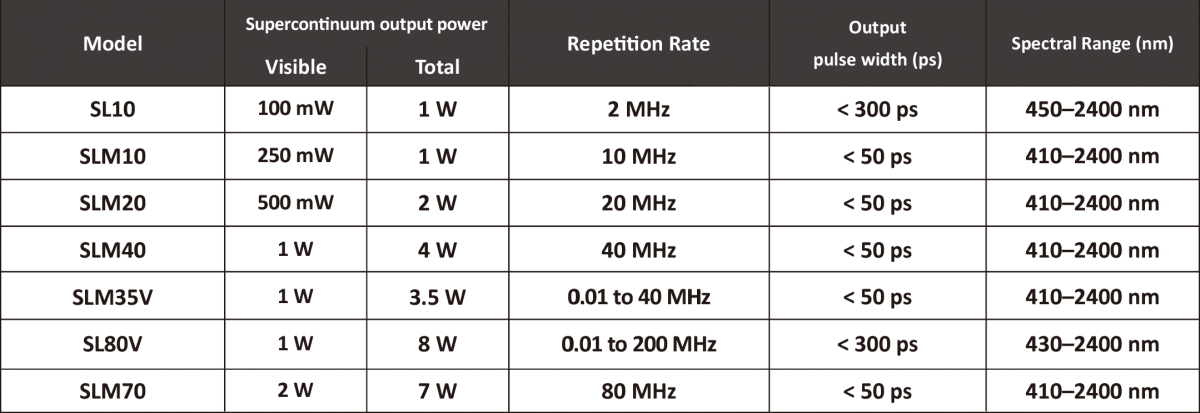 The SL-Pico’s SLM series is a mode-locked fiber laser with a fixed repetition rate and stable and uniform power spectrum in visible range, and the SL-Pico’s SLMV series has a tunable repetition rate in MHz, ensuring compatibility with a wide range of devices.